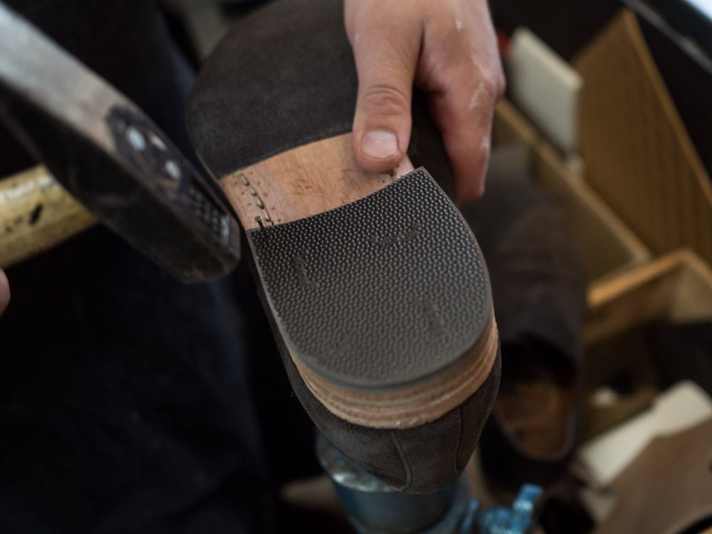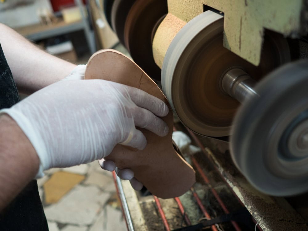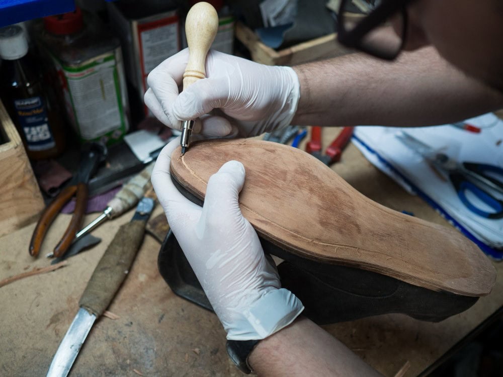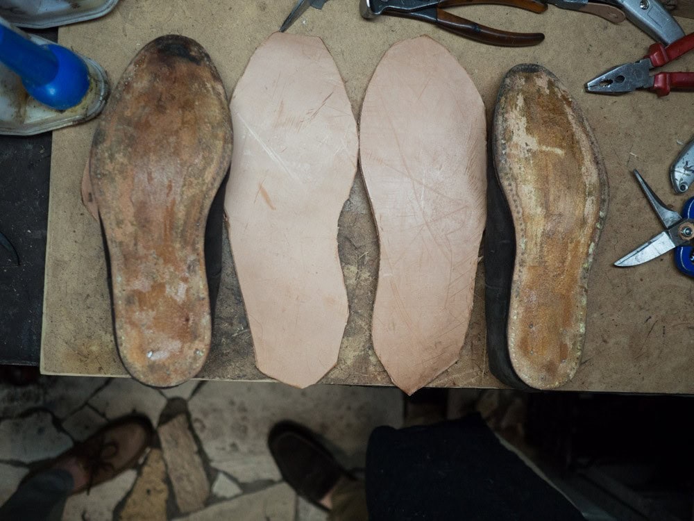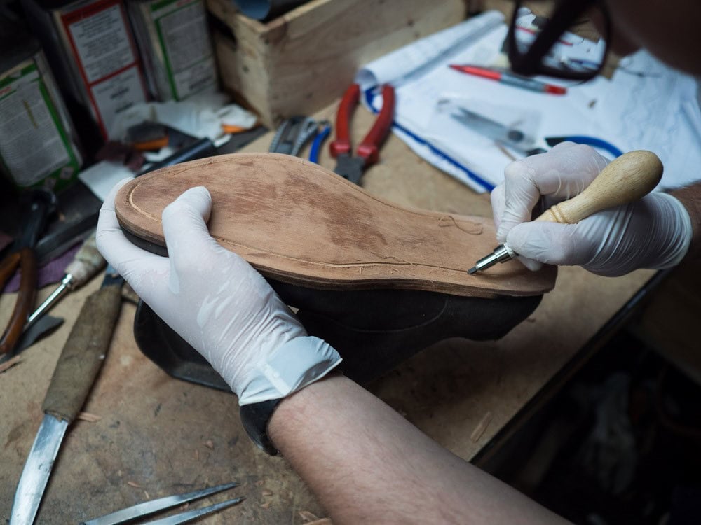 Po zdjęciu starej podeszwy używa się jej jako wzornik kształtu dla nowego spodu.