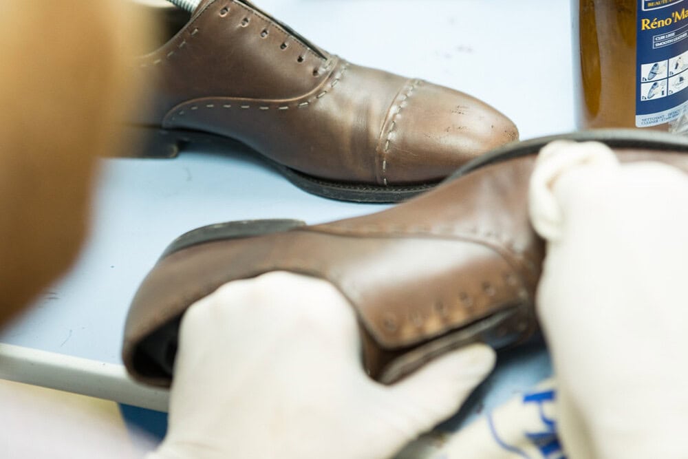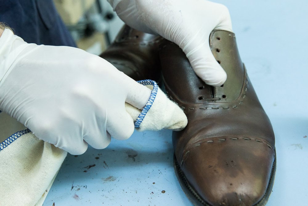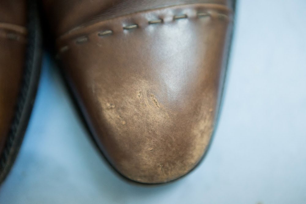 Buty nosiły wyraźne ślady zużycia i wymagały większej ingerencji w strukturę skóry. Wraz z klientem postanowiliśmy również nieco zmienić ich wygląd patynując skórę ciemniejszym kolorem niż w oryginale oraz wymieniając sznurówki.