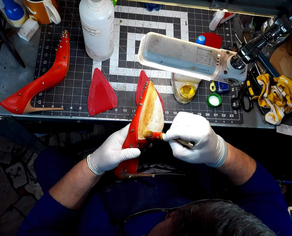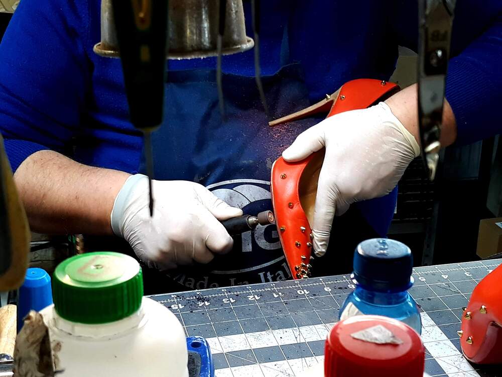 Na pierwszy ogień - wymiana skóry na obcasach. Oczywiście znalezienie identycznej skóry koniecznej do obciągnięcia obcasów jest najczęściej praktycznie niemożliwe, szczególnie przy tak "szalonym" kolorze.