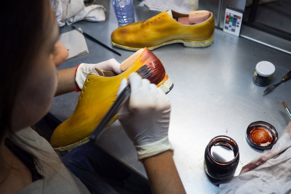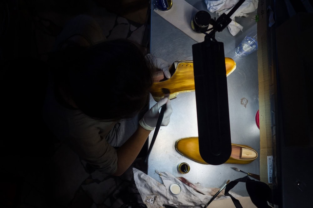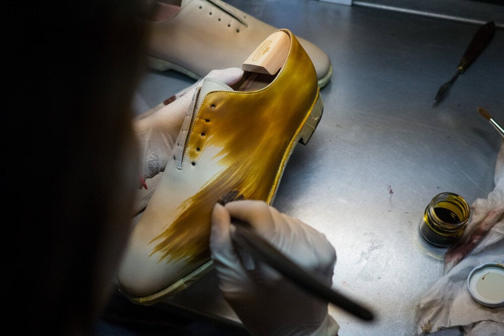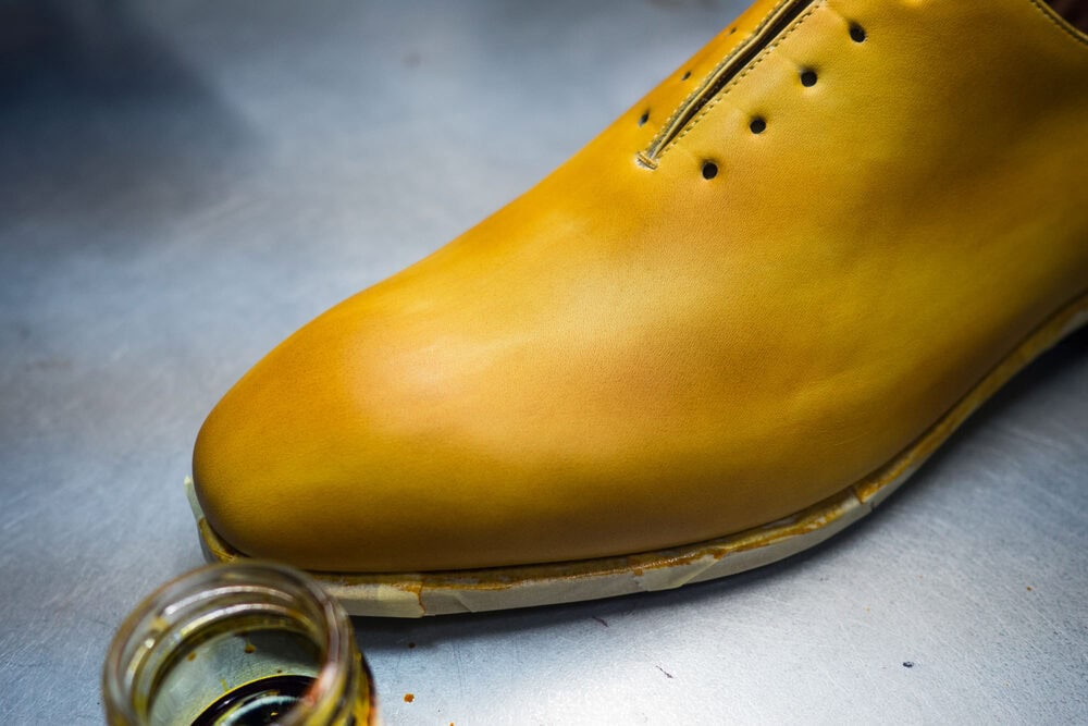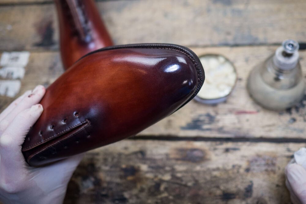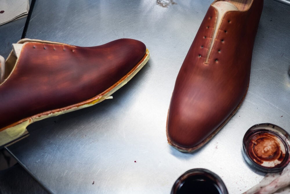 Wielki Shoe ma swoją artystyczną stronę dająca remedium na taki scenariusz, a jest nim tytułowe PATYNOWANIE. Proces uzyskania odpowiedniej barwy skóry wymaga nie mniejszej wprawy niż jej idealne uformowanie na kształt stopy. Podobnie jak przy tworzeniu obrazu gdzie artysta zaczyna od czystego płótna, tak i patynowanie ma najlepszy efekt na skórze „zerówkowej”. Jest ona najpewniejszym sprzymierzeńcem w walce o kolor, gdyż w procesie garbarskim nie została poddana barwieniu. Dzięki temu farba przyjmie się równomiernie, bez ograniczeń co do odcienia czy wzoru. Skóra fabrycznie wykończona pigmentem takiej dowolności już nie daje – o jaśniejszych od oryginalnego kolorach można zapomnieć, a nawet najdokładniejszy proces ściągania starego wykończenia nie zagwarantuje równomiernego wchłaniania nowego pigmentu.