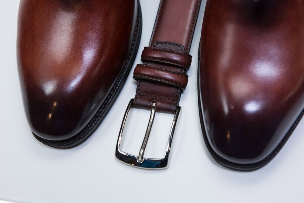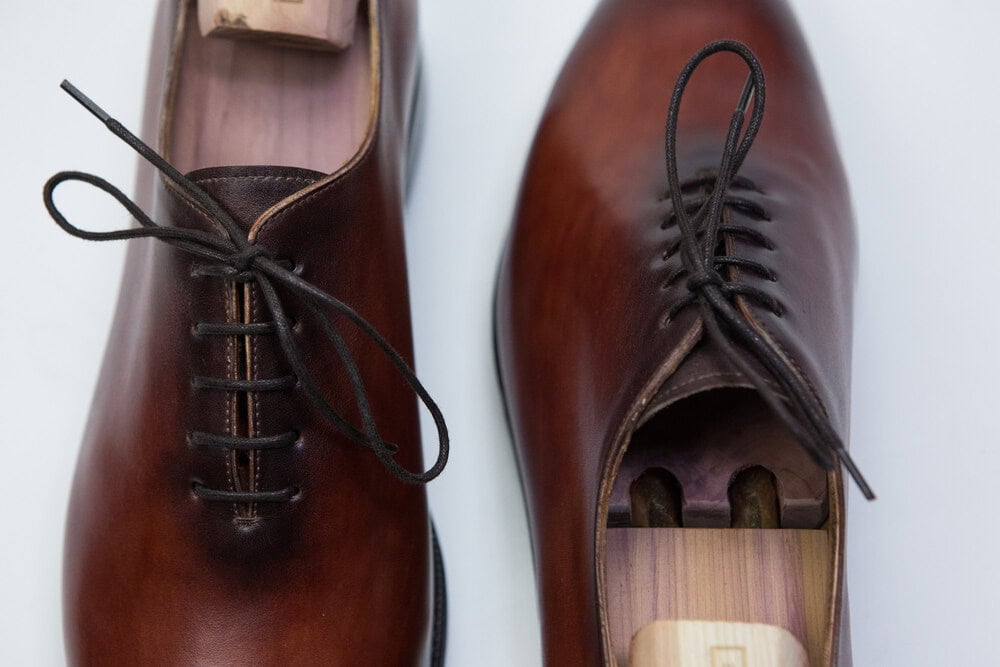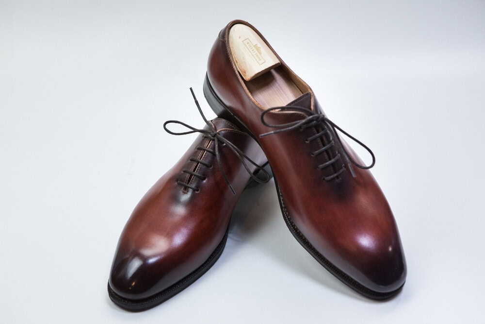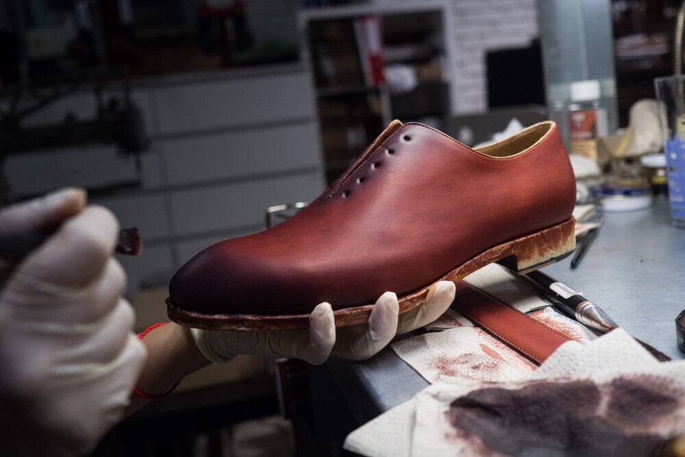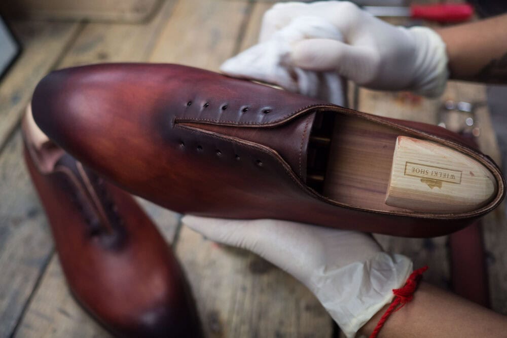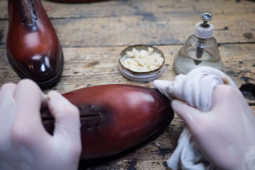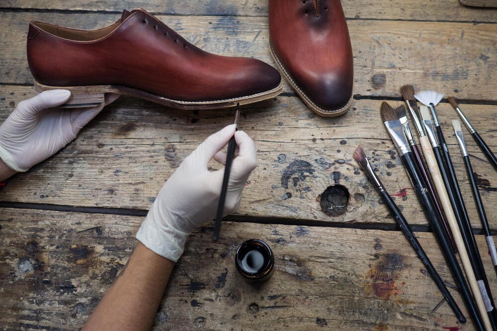 Wielki Shoe ma swoją artystyczną stronę dająca remedium na taki scenariusz, a jest nim tytułowe PATYNOWANIE. Proces uzyskania odpowiedniej barwy skóry wymaga nie mniejszej wprawy niż jej idealne uformowanie na kształt stopy. Podobnie jak przy tworzeniu obrazu gdzie artysta zaczyna od czystego płótna, tak i patynowanie ma najlepszy efekt na skórze „zerówkowej”. Jest ona najpewniejszym sprzymierzeńcem w walce o kolor, gdyż w procesie garbarskim nie została poddana barwieniu. Dzięki temu farba przyjmie się równomiernie, bez ograniczeń co do odcienia czy wzoru. Skóra fabrycznie wykończona pigmentem takiej dowolności już nie daje – o jaśniejszych od oryginalnego kolorach można zapomnieć, a nawet najdokładniejszy proces ściągania starego wykończenia nie zagwarantuje równomiernego wchłaniania nowego pigmentu.
