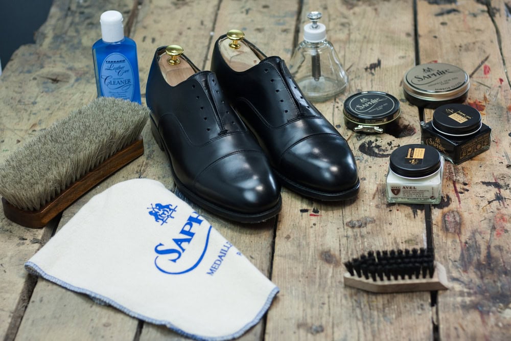 Kolejny kosmetyk w naszym repertuarze to Renowator Saphir Medaille D’or, zwany również płynnym złotem. Używając go głęboko odżywimy skórę i usuniemy tłuszcz, starą pastę i woski. Nakładamy niewielką ilość preparatu na szmatkę i wmasowujemy w skórę. Czekamy 5 minut i porządnie szczotkujemy buty, aż do uzyskania połysku.