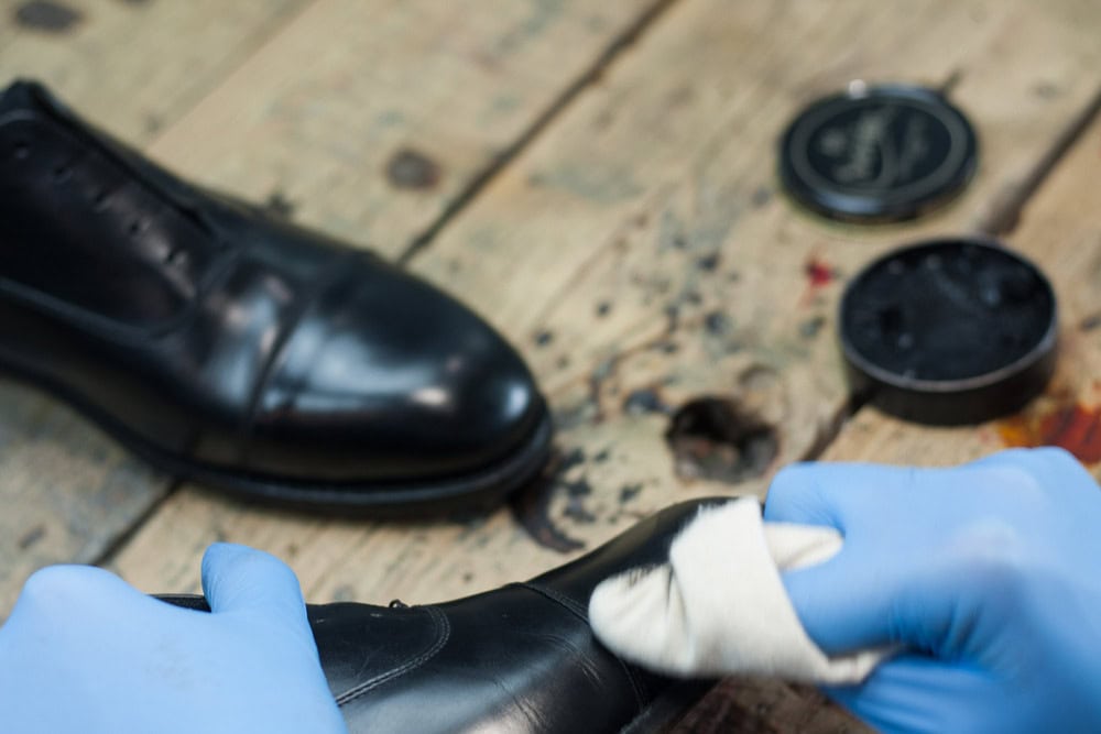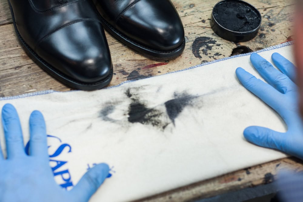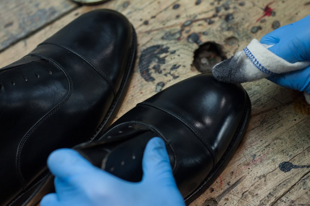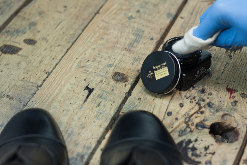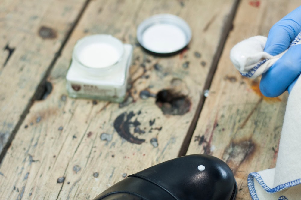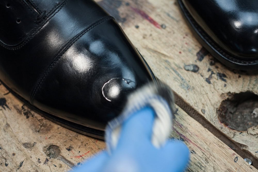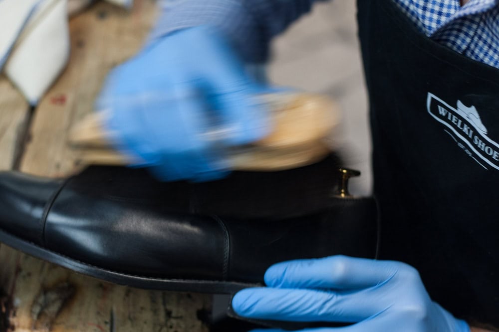 Nabieramy odrobinę wosku i delikatnie rozcieramy na czubku/pięcie, aż ślad po nim całkowicie zniknie, a ciepło wytworzone w wyniku tarcia spowoduje ponowne nabłyszczenie powierzchni buta. Powtarzamy 10-15 razy i zostawiamy buty na kolejne 20 minut.