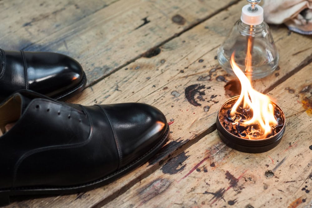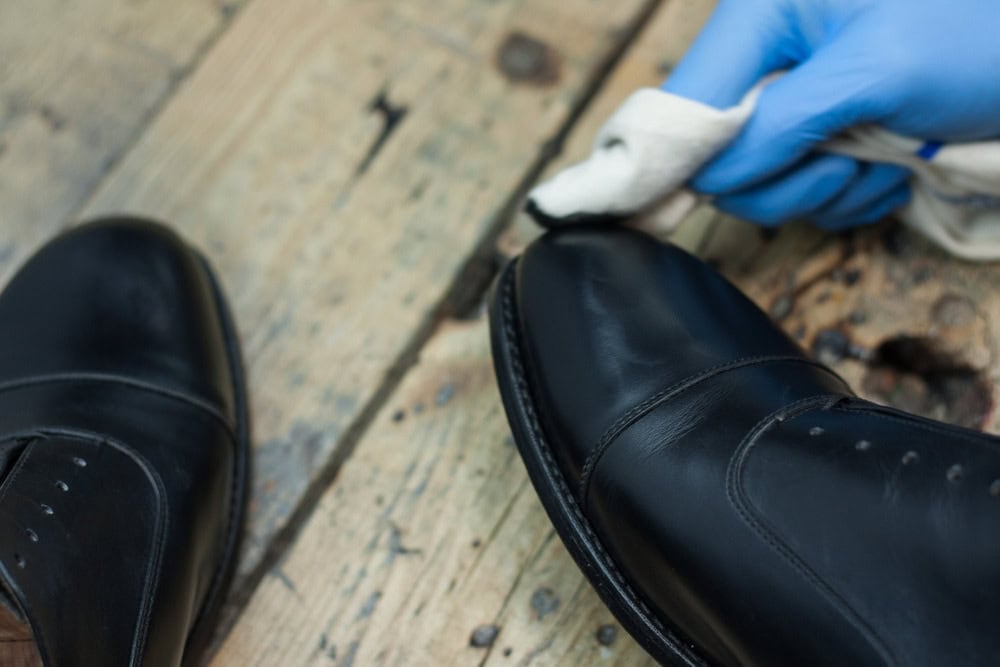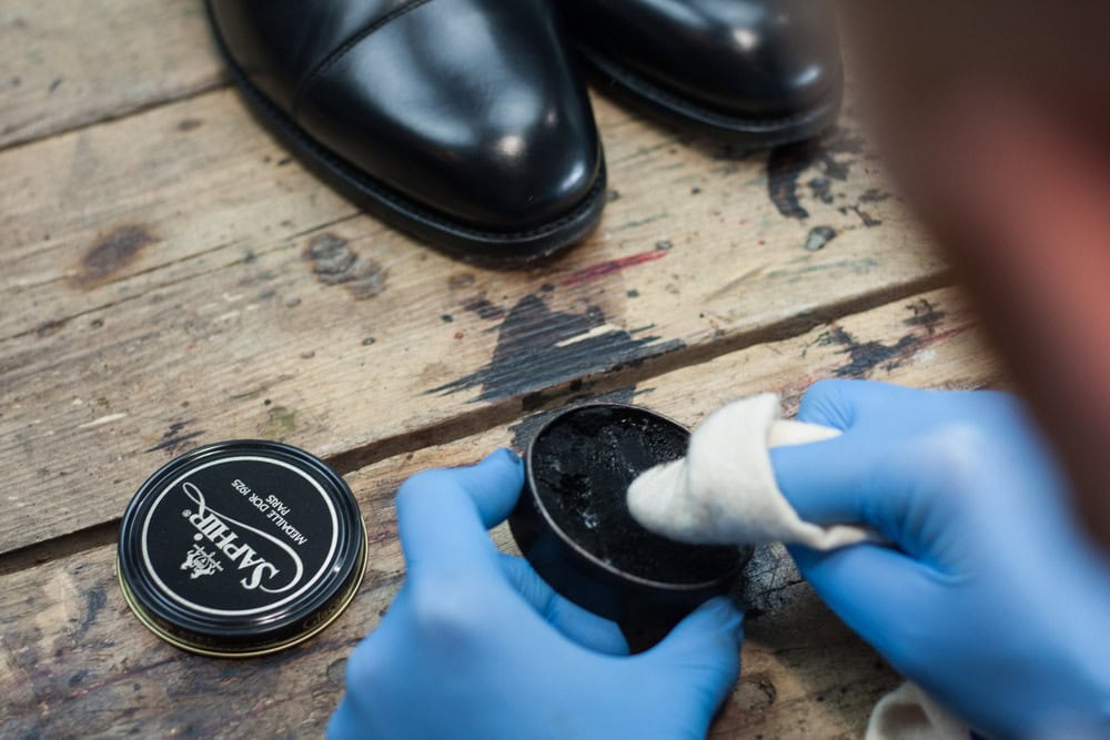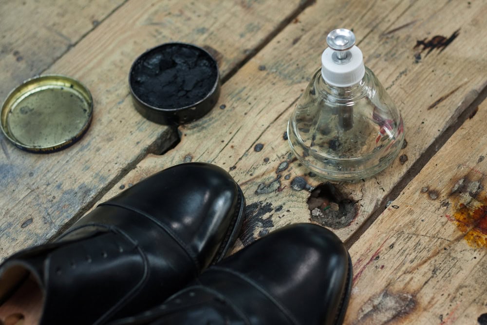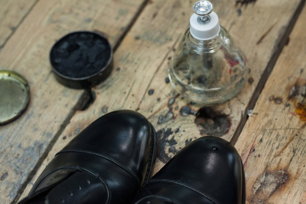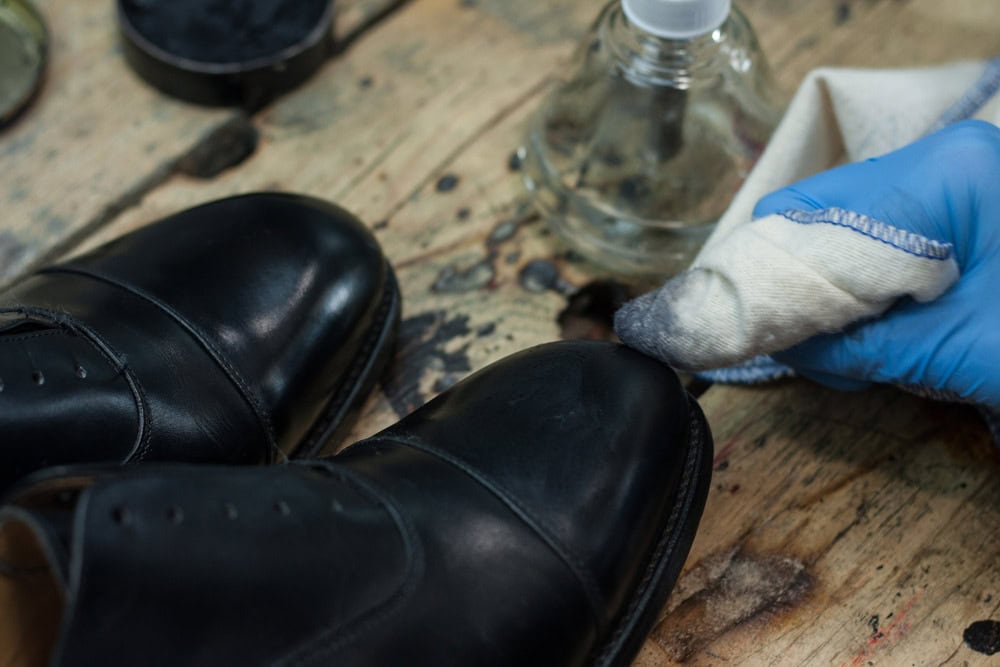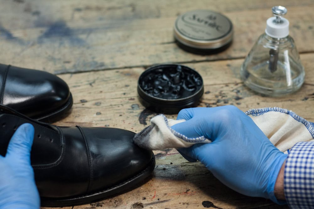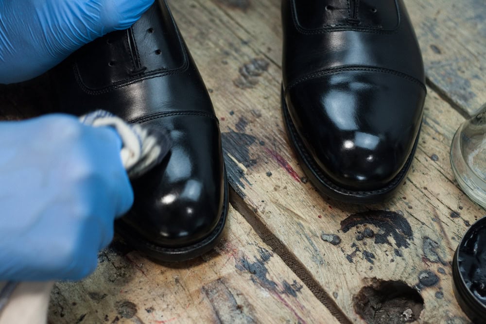 Nabieramy odrobinę wosku i delikatnie rozcieramy na czubku/pięcie, aż ślad po nim całkowicie zniknie, a ciepło wytworzone w wyniku tarcia spowoduje ponowne nabłyszczenie powierzchni buta. Powtarzamy 10-15 razy i zostawiamy buty na kolejne 20 minut.