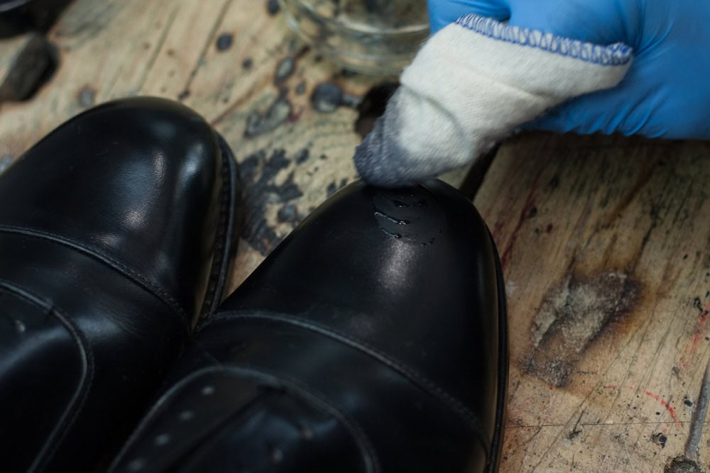 Na tym etapie czeka nas prawdziwa próba cierpliwości. Nakładamy wosk odpowiednio na czubki i pięty delikatnie masując skórę aż przestanie być matowa, a jej powierzchnia znów zacznie błyszczeć. Powtarzamy czynność 4 do 5 razy. Kluczowym elementem jest to, żeby nie próbować wszystkiego zrobić od razu, dlatego dajemy butom odetchnąć 15-20 min. Teraz zaczynamy już zabawę na poważnie – do zakrętki od wosku nalewamy odrobinę zimnej wody (przyda nam się w końcowej fazie polerki).