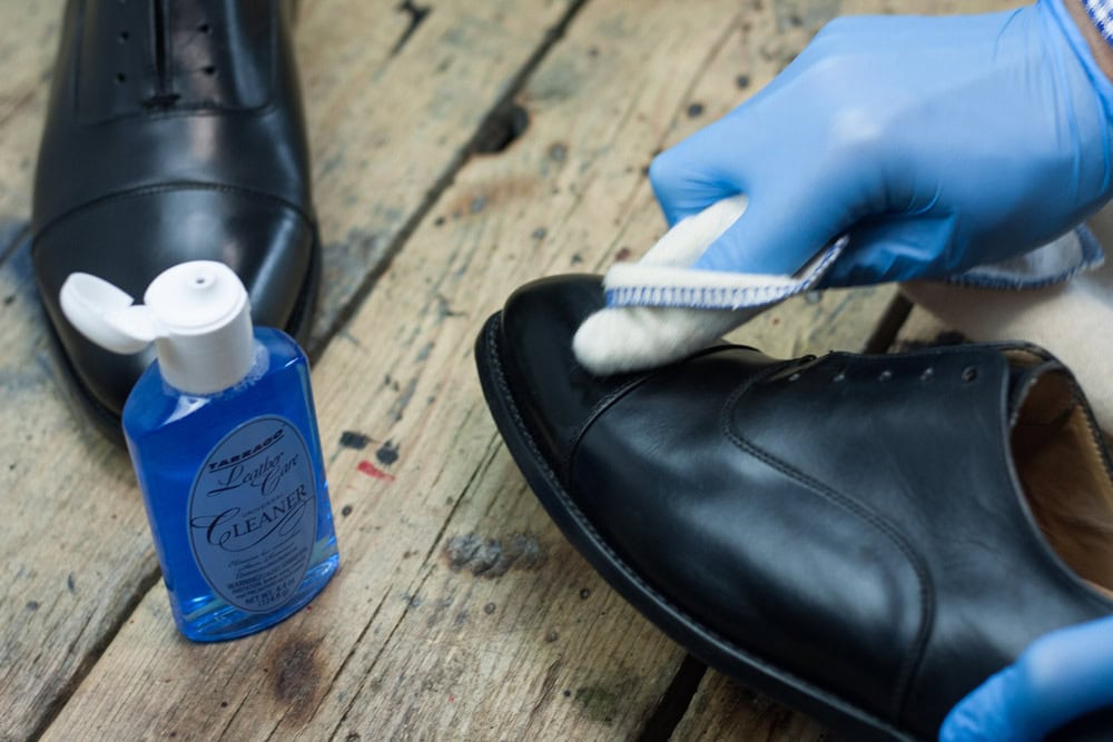 Następnie, przy użyciu szmatki nasączonej niewielką ilością Tarrago Cleanera, czyścimy skórę butów z brudu. Po 10 minutach skóra powinna odparować preparat i być gotowa do dalszych zabiegów.