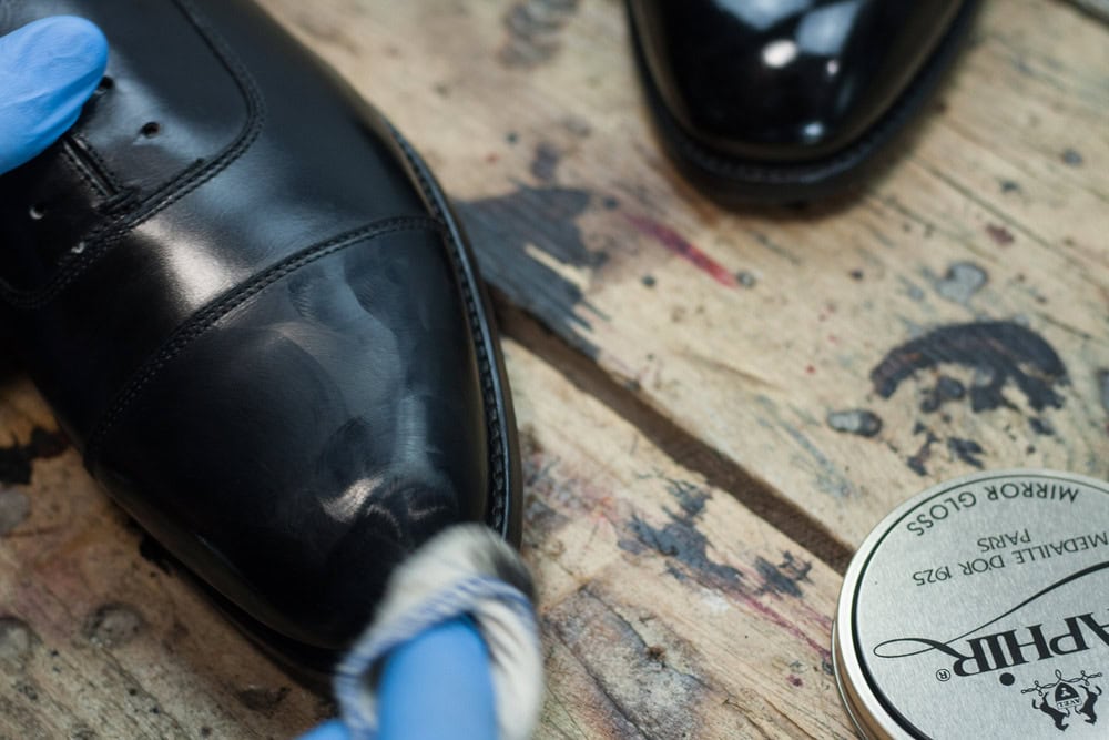 Powtarzamy czynność: w czasie, gdy jeden but wysycha, zajmujemy się drugim, nakładając 2-3 warstwy wosku na całe buty. Idziemy zrobić sobie kawę i podziwiamy to, co udało nam się już uzyskać. Dajmy butom trochę czasu – jest on kluczowym elementem w wypracowaniu prawdziwego lustra.