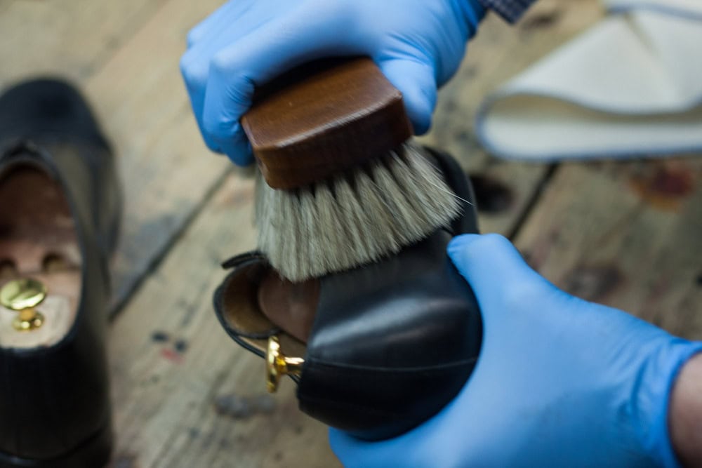 Kolejny krok to odżywienie skóry Pommadierem w dedykowanym kolorze, a następnie wyszczotkowanie szczotką z końskiego włosia.