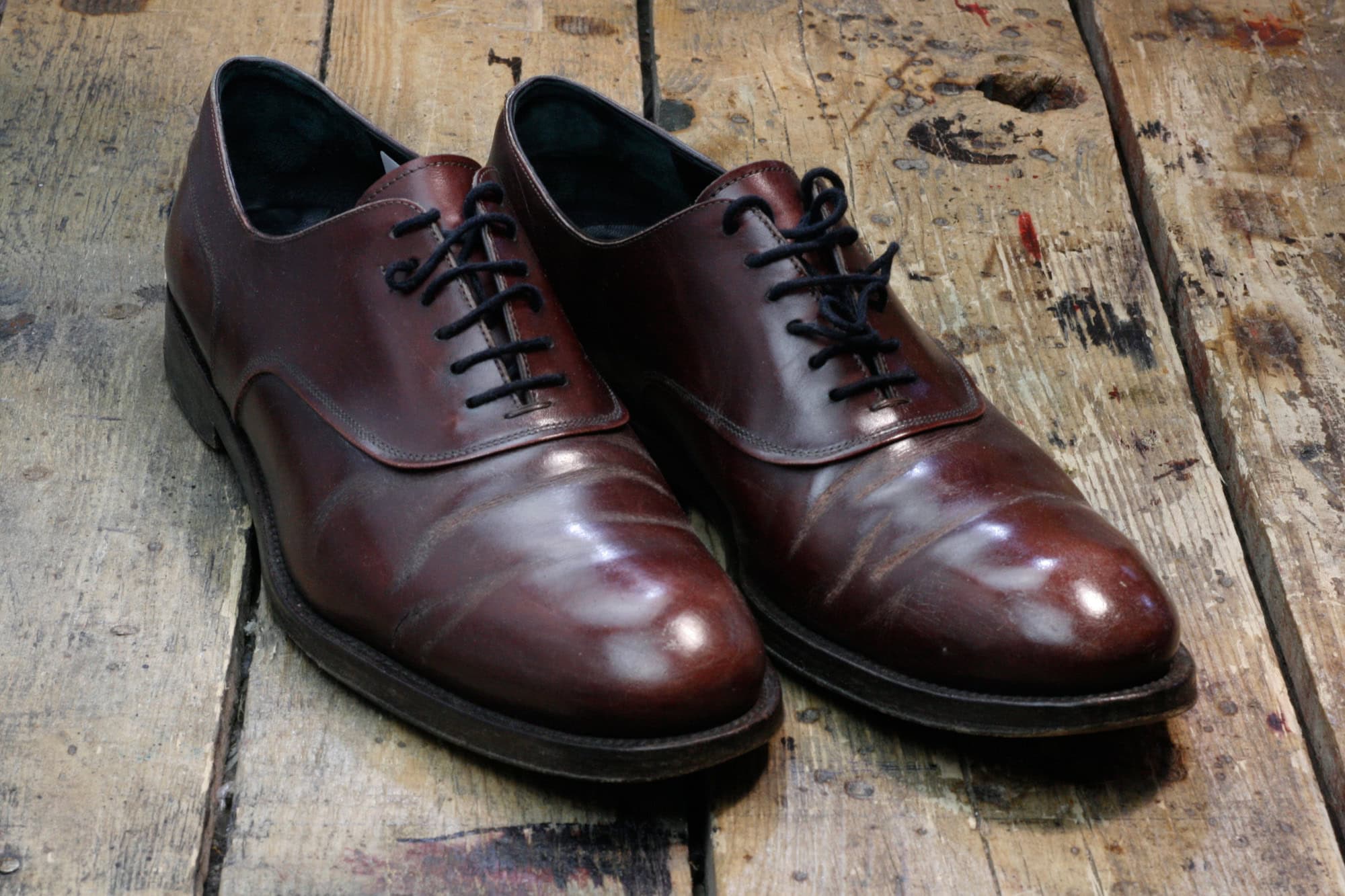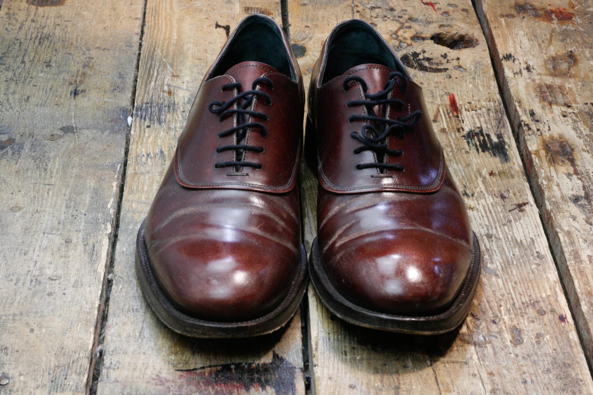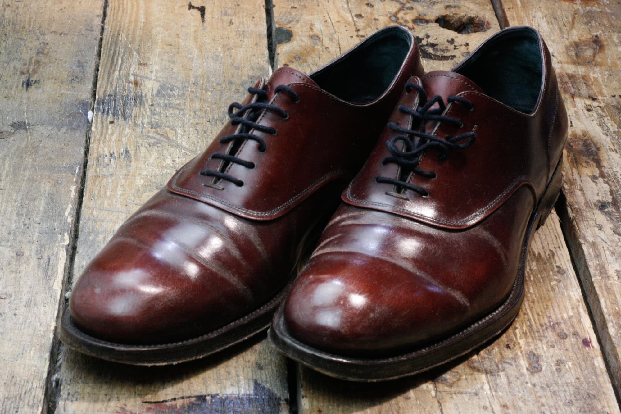 Pewnego dnia do pracowni Wielkiego Shoe trafiły lakierowane oksfordy – standardowy pakiet dla takiego wykończenia to odświeżenie preparatem do skór zamkniętych (na przykład Saphir Vernis Rife). W tym przypadku taki zakres prac okazałby się jednkak niewystarczajacy, ponieważ klient używał do ich pielęgnacji nieodpowiednich kosmetyków. Z biegiem czasu utworzyły one nieestetycznie wyglądającą skorupę, popękaną w miejscach w których pracuje cholewka.