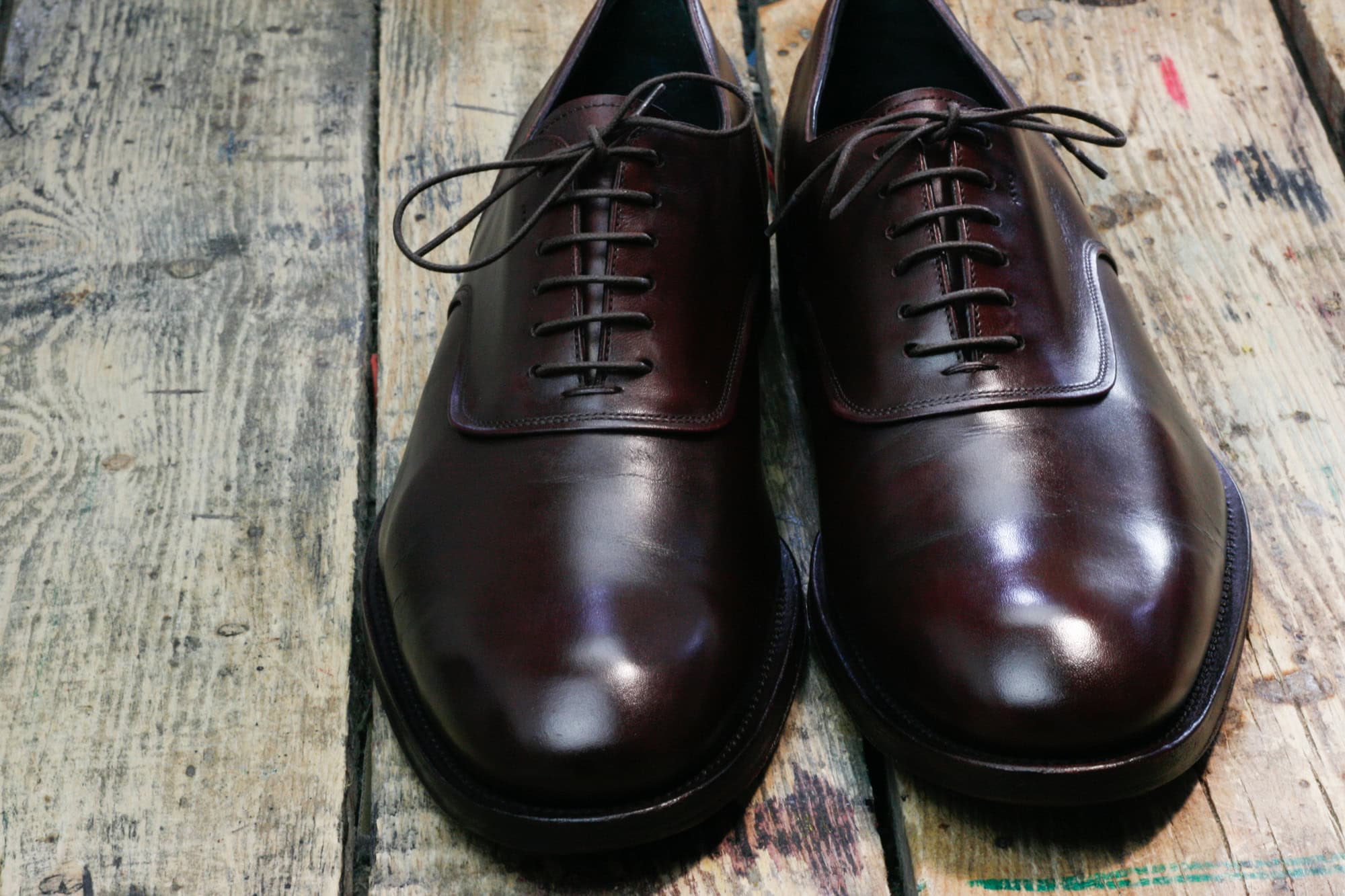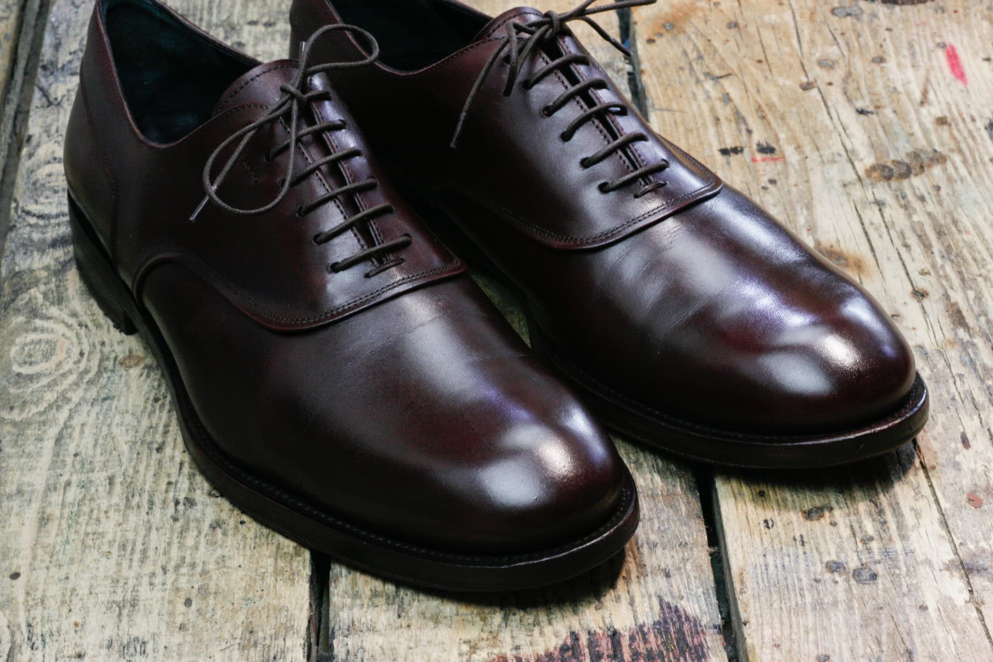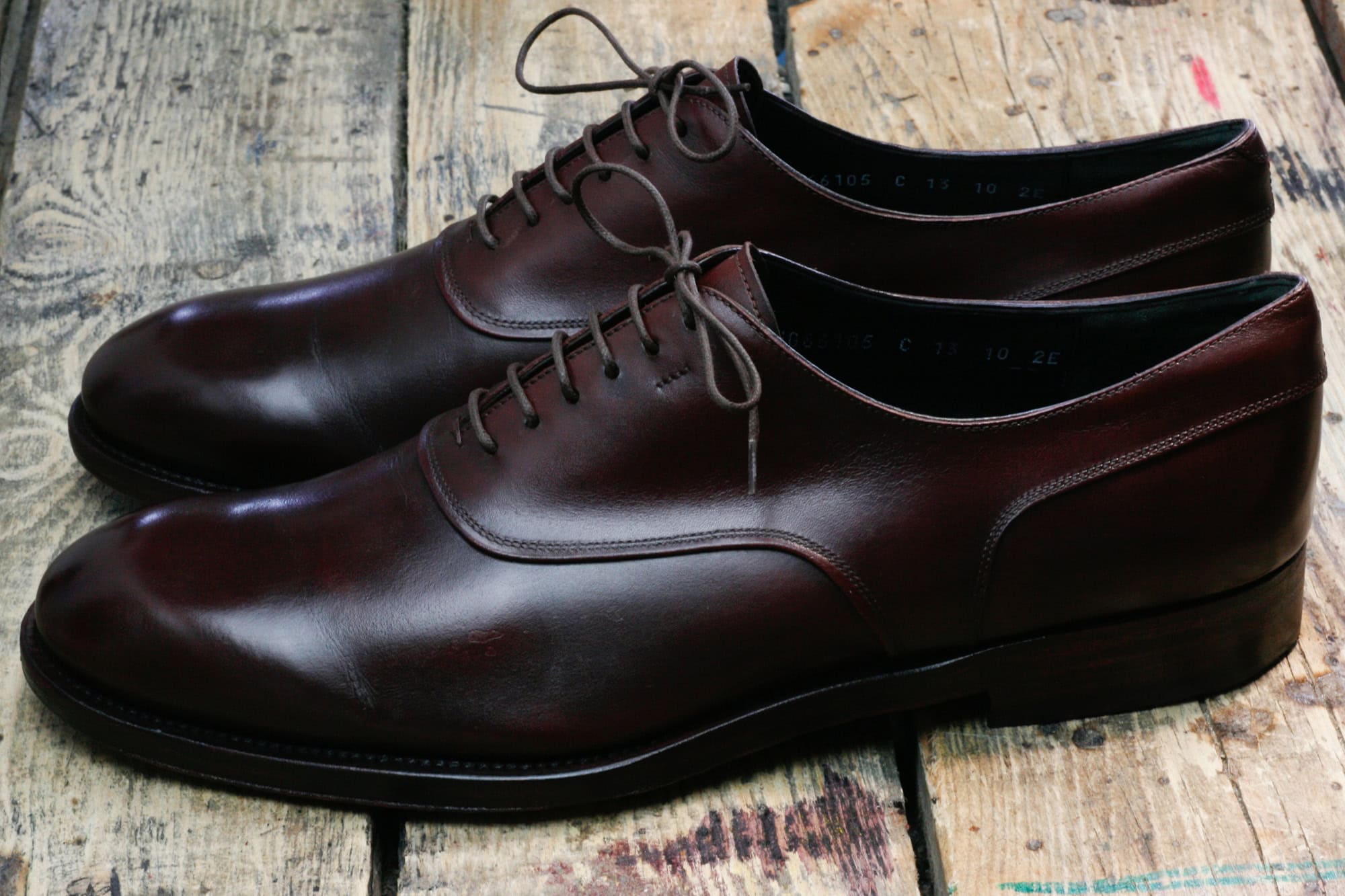 Pewnego dnia do pracowni Wielkiego Shoe trafiły lakierowane oksfordy – standardowy pakiet dla takiego wykończenia to odświeżenie preparatem do skór zamkniętych (na przykład Saphir Vernis Rife). W tym przypadku taki zakres prac okazałby się jednkak niewystarczajacy, ponieważ klient używał do ich pielęgnacji nieodpowiednich kosmetyków. Z biegiem czasu utworzyły one nieestetycznie wyglądającą skorupę, popękaną w miejscach w których pracuje cholewka.